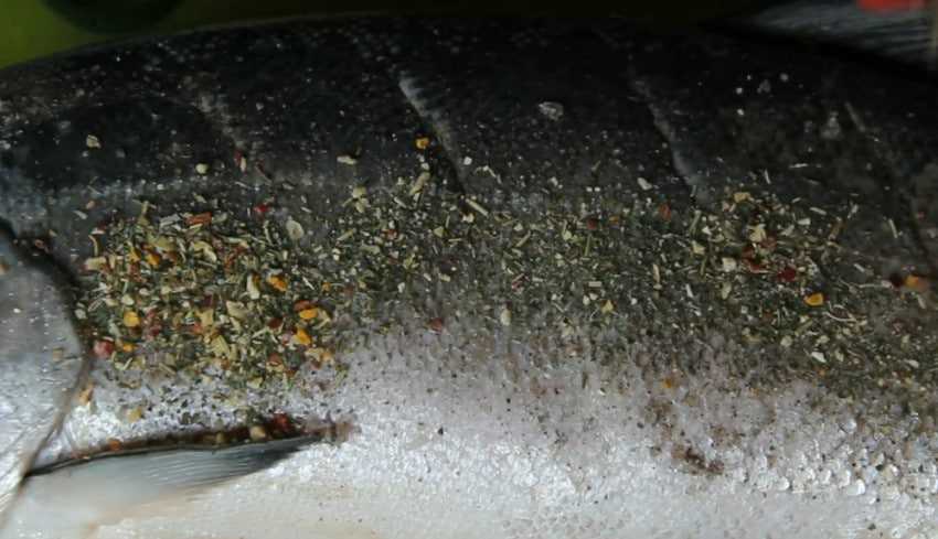 2. Присыпьте рыбу солью, чёрным молотым перцем и специями для барбекю. Вотрите все специи в надрезы.