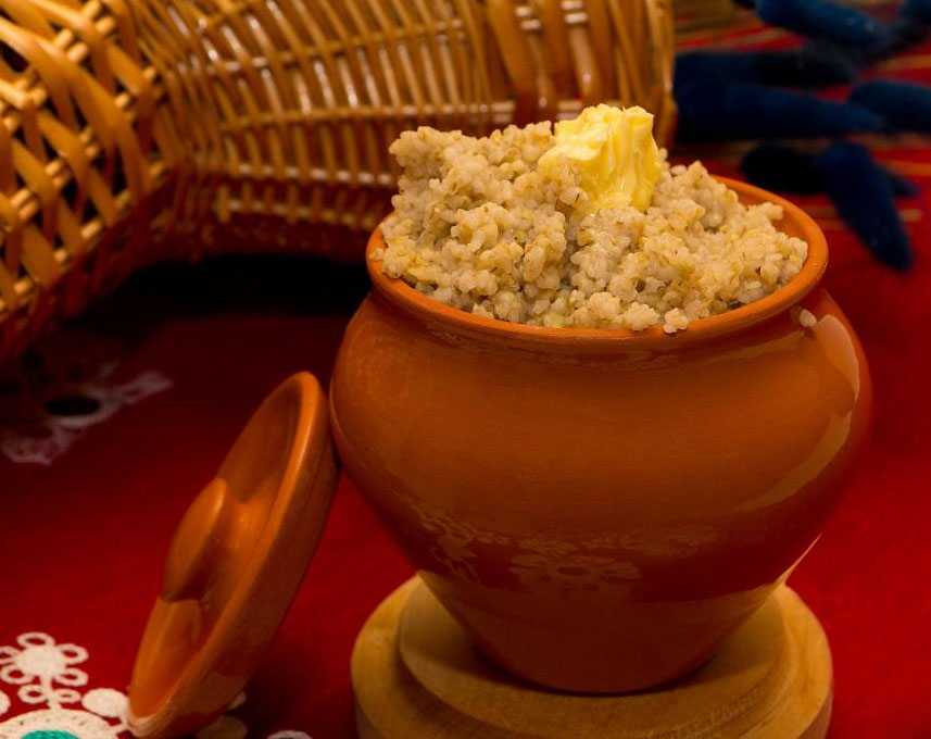 - Залейте ячневую крупу водой и доведите до кипения, затем добавьте поджаренный лук. Проварившись таким образом, каша пропитается маслом и получит необходимую сочность.