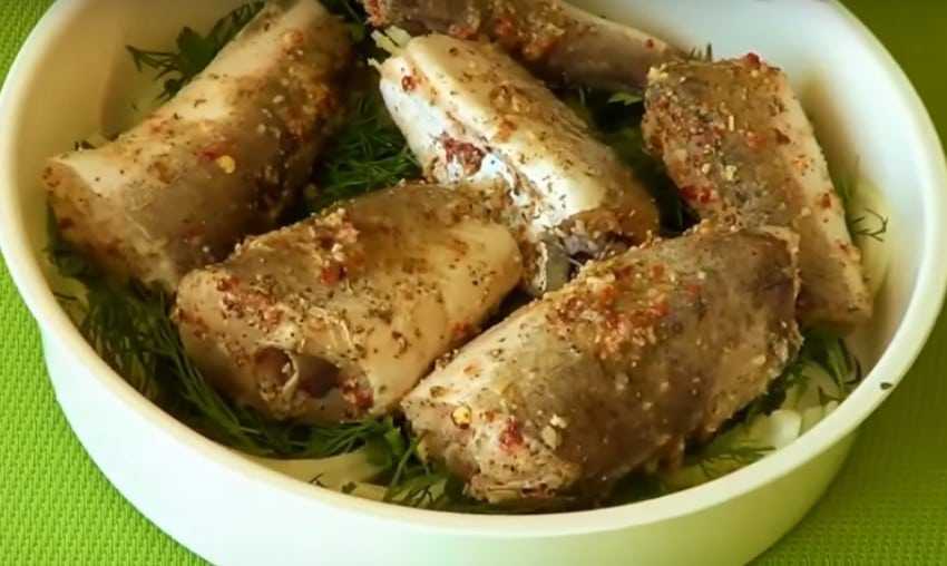 маринуют в холодильнике в течение часа под тонко нарезанным репчатым луком, политым лимонным соком;