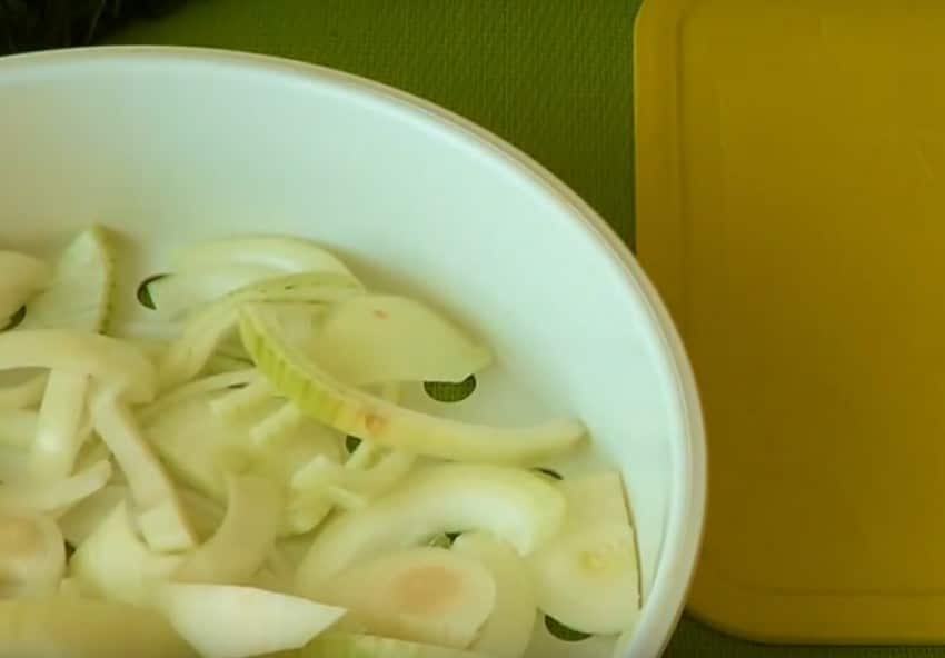 3. За это время крупно нарежьте лук полукольцами и выложите его в форму для приготовления на пару в мультиварке.