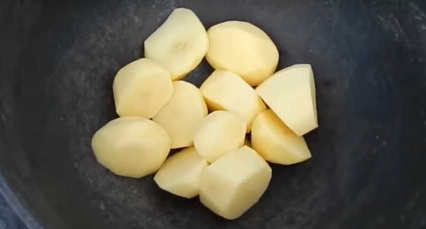 - В это время займитесь подготовкой овощей. Почистите картофель и нарежьте его некрупными кубиками. Промойте кусочки холодной водой. вымойте и очистите от кожуры морковь. Нарежьте её небольшими брусочками.